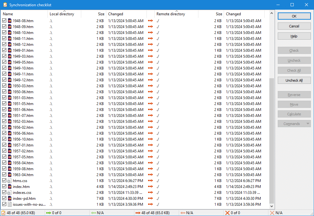 . 2024-01-18 17:16:58.808 Collecting synchronization list for local directory 'C:\Internet\WEBPAGES\518first.com\manuals\house' and remote directory '/home/dh_kpgjxc/518first.com/manuals/house', mode = Remote, params = 0x443 (Delete, NoConfirmation, *PreviewChanges, BySize), file mask = '' . 2024-01-18 17:16:58.830 Local file 'C:\Internet\WEBPAGES\518first.com\manuals\house\.' [2024-01-17T16:58:54.115Z] [0] excluded from synchronization . 2024-01-18 17:16:58.830 Local file 'C:\Internet\WEBPAGES\518first.com\manuals\house\..' [2024-01-17T16:58:54.115Z] [0] excluded from synchronization . 2024-01-18 17:16:58.835 Local file 'C:\Internet\WEBPAGES\518first.com\manuals\house\index.htm' [2024-01-17T17:01:59.679Z] [60620] included to synchronization . 2024-01-18 17:16:58.840 Listing directory "/home/dh_kpgjxc/518first.com/manuals/house". > 2024-01-18 17:16:58.840 Type: SSH_FXP_OPENDIR, Size: 51, Number: 291737867 < 2024-01-18 17:16:58.840 Type: SSH_FXP_STATUS, Size: 24, Number: 291737604 . 2024-01-18 17:16:58.840 Discarding reserved response < 2024-01-18 17:16:58.916 Type: SSH_FXP_HANDLE, Size: 13, Number: 291737867 > 2024-01-18 17:16:58.916 Type: SSH_FXP_READDIR, Size: 13, Number: 291738124 < 2024-01-18 17:16:59.006 Type: SSH_FXP_NAME, Size: 14057, Number: 291738124 > 2024-01-18 17:16:59.006 Type: SSH_FXP_READDIR, Size: 13, Number: 291738380 < 2024-01-18 17:16:59.086 Type: SSH_FXP_NAME, Size: 12632, Number: 291738380 > 2024-01-18 17:16:59.086 Type: SSH_FXP_READDIR, Size: 13, Number: 291738636 < 2024-01-18 17:16:59.166 Type: SSH_FXP_STATUS, Size: 28, Number: 291738636 < 2024-01-18 17:16:59.171 Status code: 1 > 2024-01-18 17:16:59.171 Type: SSH_FXP_CLOSE, Size: 13, Number: 291738884 . 2024-01-18 17:16:59.171 .;d;0;2024-01-18T22:04:31.000Z;4;"dh_kpgjxc" [6447247];"pg11291404" [2284185];rwxr-xr-x;0 . 2024-01-18 17:16:59.171 ..;d;0;2024-01-18T22:04:30.000Z;4;"dh_kpgjxc" [6447247];"pg11291404" [2284185];rwxr-xr-x;0 . 2024-01-18 17:16:59.178 index.htm;-;59462;2024-01-17T17:01:59.000Z;4;"dh_kpgjxc" [6447247];"pg11291404" [2284185];rw-r--r--;0 . 2024-01-18 17:16:59.181 Local file 'C:\Internet\WEBPAGES\518first.com\manuals\house\index.htm' [2024-01-17T17:01:59.679Z] [60620] is modified comparing to remote file '/home/dh_kpgjxc/518first.com/manuals/house/index.htm' [2024-01-17T17:01:59.000Z] [59462] . 2024-01-18 17:16:59.181 Remote file '/home/dh_kpgjxc/518first.com/manuals/house/index.htm' [2024-01-17T17:01:59.000Z] [59462] is modified comparing to local file 'C:\Internet\WEBPAGES\518first.com\manuals\house\index.htm' [2024-01-17T17:01:59.679Z] [60620] . 2024-01-18 17:17:01.756 Synchronizing local directory 'C:\Internet\WEBPAGES\518first.com\manuals\house\' with remote directory '/home/dh_kpgjxc/518first.com/manuals/house/', params = 0x443 (Delete, NoConfirmation, *PreviewChanges, BySize) . 2024-01-18 17:17:01.768 Copying 1 files/directories to remote directory "/home/dh_kpgjxc/518first.com/manuals/house/" - total size: 60,620 . 2024-01-18 17:17:01.768 PrTime: Yes; PrRO: No; Rght: rw-r--r--; PrR: No (No); FnCs: N; RIC: 0100; Resume: S (102400); CalcS: No; Mask: *.* . 2024-01-18 17:17:01.768 TM: M; ClAr: No; RemEOF: No; RemBOM: No; CPS: 0; NewerOnly: No; EncryptNewFiles: No; ExcludeHiddenFiles: No; ExcludeEmptyDirectories: No; InclM: ; ResumeL: 0 . 2024-01-18 17:17:01.768 AscM: *.*html; *shtml; *.htm; *.txt; *.php; *.php3; *.cgi; *.c; *.cpp; *.h; *.pas; *.bas; *.tex; *.pl; *.js; .htaccess; *.xtml; *.css; *.cfg; *.ini; *.sh; *.xml; *.htaccess . 2024-01-18 17:17:01.772 File: 'C:\Internet\WEBPAGES\518first.com\manuals\house\index.htm' [2024-01-17T17:01:59.679Z] [60620] . 2024-01-18 17:17:01.772 Copying "C:\Internet\WEBPAGES\518first.com\manuals\house\index.htm" to remote directory started. . 2024-01-18 17:17:01.772 Ascii transfer mode selected. . 2024-01-18 17:17:01.773 Opening remote file. > 2024-01-18 17:17:01.773 Type: SSH_FXP_OPEN, Size: 77, Number: 291740163 < 2024-01-18 17:17:01.773 Type: SSH_FXP_STATUS, Size: 24, Number: 291739908 . 2024-01-18 17:17:01.773 Discarding reserved response < 2024-01-18 17:17:01.845 Type: SSH_FXP_HANDLE, Size: 13, Number: 291740163 > 2024-01-18 17:17:01.845 Type: SSH_FXP_WRITE, Size: 32150, Number: 291740678 . 2024-01-18 17:17:01.850 Skipped 1 SSH_FXP_WRITE packets > 2024-01-18 17:17:01.850 Type: SSH_FXP_CLOSE, Size: 13, Number: 291741188 > 2024-01-18 17:17:01.850 Type: SSH_FXP_SETSTAT, Size: 73, Number: 291740425 < 2024-01-18 17:17:01.943 Type: SSH_FXP_STATUS, Size: 24, Number: 291740678 < 2024-01-18 17:17:01.943 Status code: 0 . 2024-01-18 17:17:01.994 Skipped 1 SSH_FXP_STATUS packets < 2024-01-18 17:17:01.994 Type: SSH_FXP_STATUS, Size: 24, Number: 291741188 < 2024-01-18 17:17:01.999 Status code: 0 . 2024-01-18 17:17:01.999 Preserving timestamp [2024-01-17T17:01:59.000Z] < 2024-01-18 17:17:01.999 Type: SSH_FXP_STATUS, Size: 24, Number: 291740425 < 2024-01-18 17:17:01.999 Status code: 0 . 2024-01-18 17:17:01.999 Transfer done: 'C:\Internet\WEBPAGES\518first.com\manuals\house\index.htm' => '/home/dh_kpgjxc/518first.com/manuals/house/index.htm' [59462] . 2024-01-18 17:17:01.999 Copying finished: Transferred: 59,462, Elapsed: 0:00:00, CPS: 244,699/s . 2024-01-18 17:17:02.003 Listing directory "/home/dh_kpgjxc/518first.com/manuals/house". > 2024-01-18 17:17:02.004 Type: SSH_FXP_OPENDIR, Size: 51, Number: 291741451 < 2024-01-18 17:17:02.087 Type: SSH_FXP_HANDLE, Size: 13, Number: 291741451 > 2024-01-18 17:17:02.087 Type: SSH_FXP_READDIR, Size: 13, Number: 291741708 < 2024-01-18 17:17:02.166 Type: SSH_FXP_NAME, Size: 14057, Number: 291741708 > 2024-01-18 17:17:02.166 Type: SSH_FXP_READDIR, Size: 13, Number: 291741964 < 2024-01-18 17:17:02.243 Type: SSH_FXP_NAME, Size: 12632, Number: 291741964 > 2024-01-18 17:17:02.248 Type: SSH_FXP_READDIR, Size: 13, Number: 291742220 < 2024-01-18 17:17:02.323 Type: SSH_FXP_STATUS, Size: 28, Number: 291742220 < 2024-01-18 17:17:02.323 Status code: 1 > 2024-01-18 17:17:02.323 Type: SSH_FXP_CLOSE, Size: 13, Number: 291742468 . 2024-01-18 17:17:02