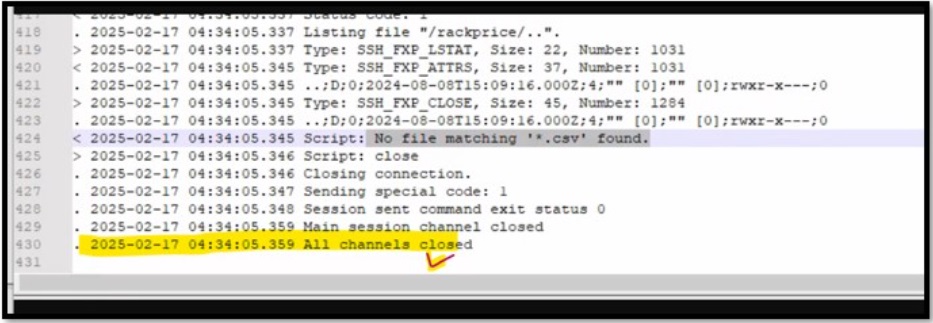 @dranaware, who opened this case, and wanted to try and help provide more context on the issue we saw. WinSCP is being used by an internal application programmatically. Our exe calls WinSCP and tells it to move files from one location to another on a regular cadence. This was setup in November 2024 and was working just fine until February 17th. On February 17th at 4:34AM MT the logs from WinSCP just stopped. It seems it ran successfully and would/should have been ready to run the next time it was called. However for the next 4 days (until it was noticed) WinSCP never ran when called, never logged any details, and never showed any error message. The support team finally noticed it had not been running and, as a workaround, set it up to run from the server D drive rather than the C drive where it had previously been running. This worked and WinSCP has been running just fine ever since. What we are trying to understand, and find the root cause of, is why WinSCP just stopped responding/running on February 17th until it was noticed and required manual intervention to get it going again. Another thing that was noticed, 12 minutes after the last log entry from WinSCP, on that same server, a file simply called