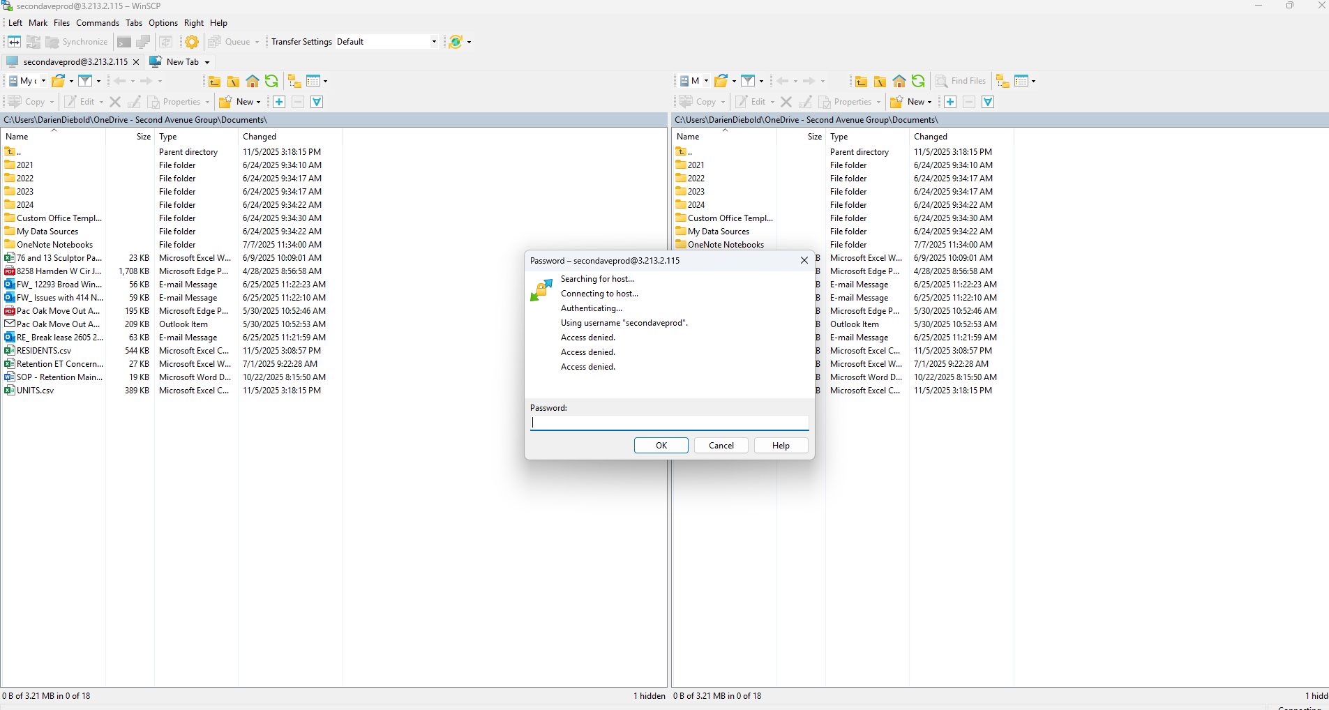 I am a newer user to Win SCP. I was successful in logging in and working out of it last week but now I am receiving an Access denied comment. Why am I now receiving the error? Please see screenshot below.