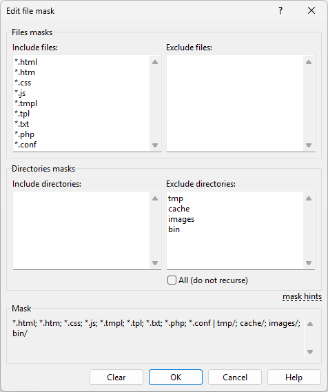 When File Mask dialog opens, individual masks in your file mask (if any) are separated into Include files, Exclude files, Include directories and Exclude directories groups. Each mask in every group is on a separate line.