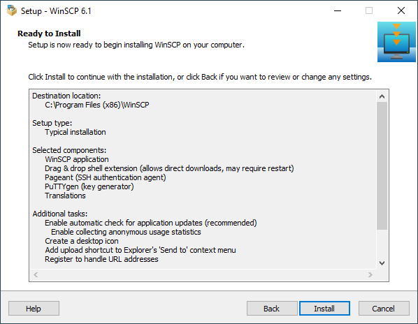 On the Ready to Install page of the WinSCP Installer, you review your installation settings and start the installation.
