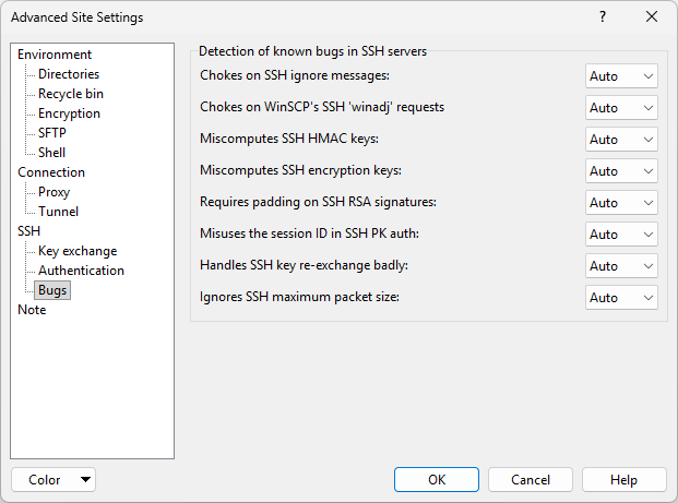 The Bugs page on the Advanced Site Settings dialog allows you to configure the bugs WinSCP should expect to see in the SSH server.