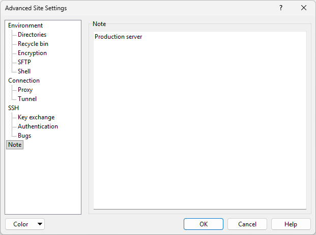 The Note page on the Advanced Site Settings dialog allows user to enter arbitrary note for a site. The note is shown on Login dialog, when the respective site is selected.