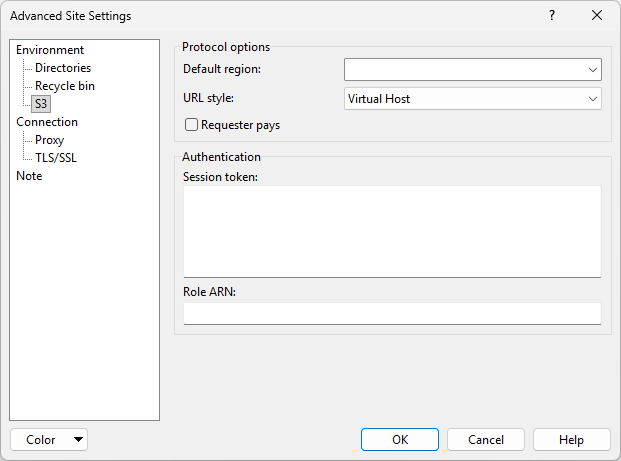 The S3 page on the Advanced Site Settings dialog allows user to configure Amazon S3 protocol specific options.