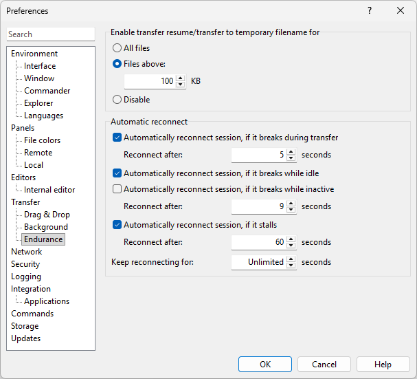 Use the Automatically reconnect session, if it breaks during transfer checkbox to enable reconnection of the session (and resuming transfer) when it breaks while transferring files. This is supported with SFTP and FTP protocols.