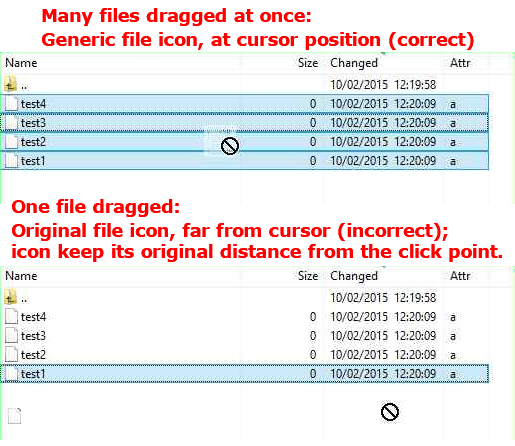 I have the commander view, and I click a file to then drag and drop it to the remote folder. I noticed something about the icon representing the file's extension, and the actual location of the mouse pointer, taking the shape of a forbidden sign as long as we're not in the remote location.